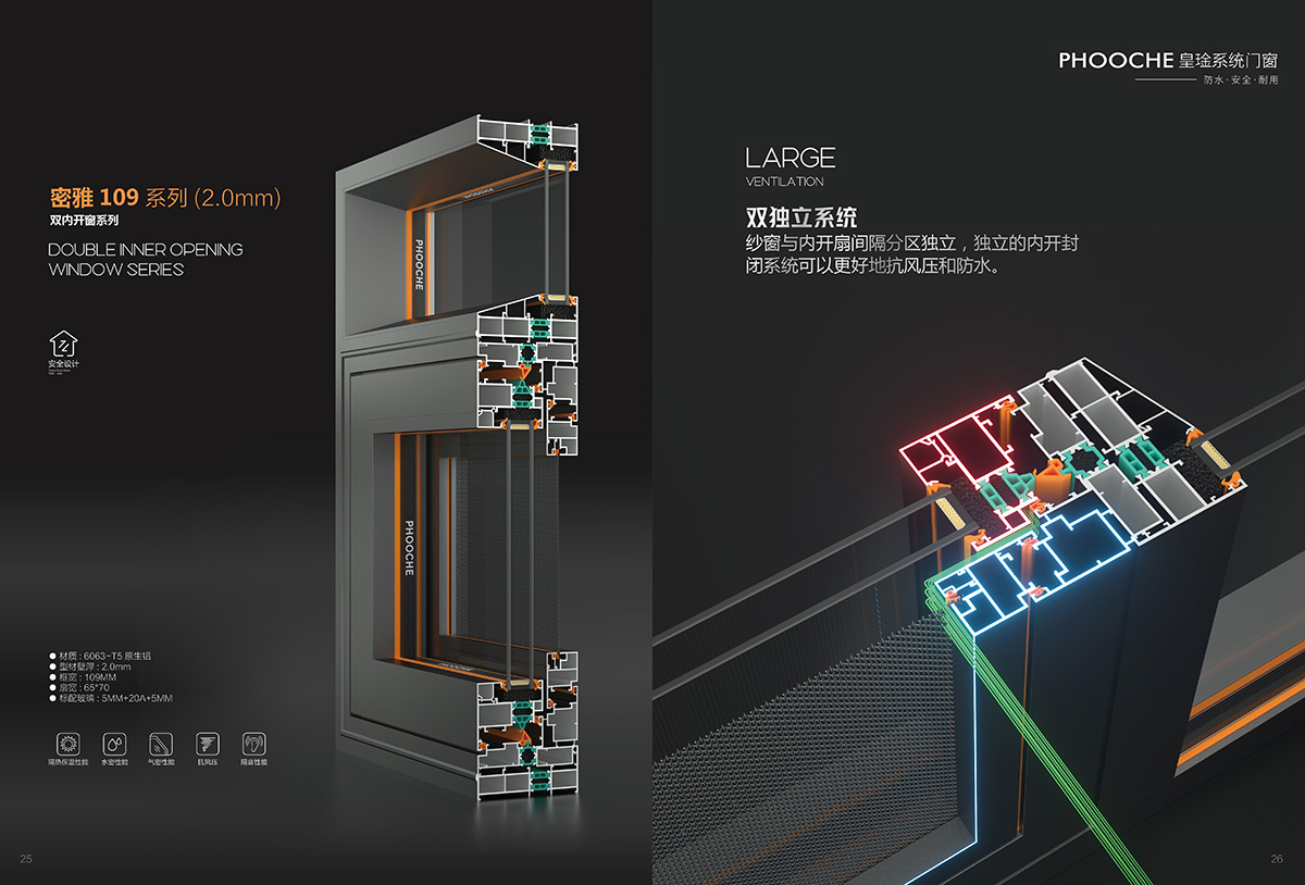 ●Adopting reinforced PA66GF25 nylon insulation strips that have passed multi chamber testing, it provides better sound and heat insulation, good weather resistance, and is less prone to aging and deformation.